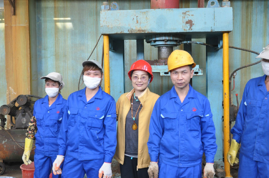 來到精煉一車間,桁吊從空中平移過來一排成形的鎳板,場(chǎng)面恢宏,鎳板剛一觸地,工人們分工明確,一組工人熟練地快速抽掉銅棒,一組工人嫻熟地取下鎳板,除去鎳板頂部的綠色雜質(zhì),還有一組工人迅速把鎳板疊加整齊,送上打包機(jī)捆扎牢固。同時(shí),工人們打掃場(chǎng)地,收拾銅棒和鋼絲繩,行動(dòng)迅速,忙而不亂,有條不紊。看到這情景,趙總很感動(dòng),佩服工人勞動(dòng)技能好,工作熱情高,應(yīng)工業(yè)的要求與工人合影留念,工人們高興地站在趙總兩邊,愉快合影。離開車間時(shí),趙總不停向工人們揮手致意。