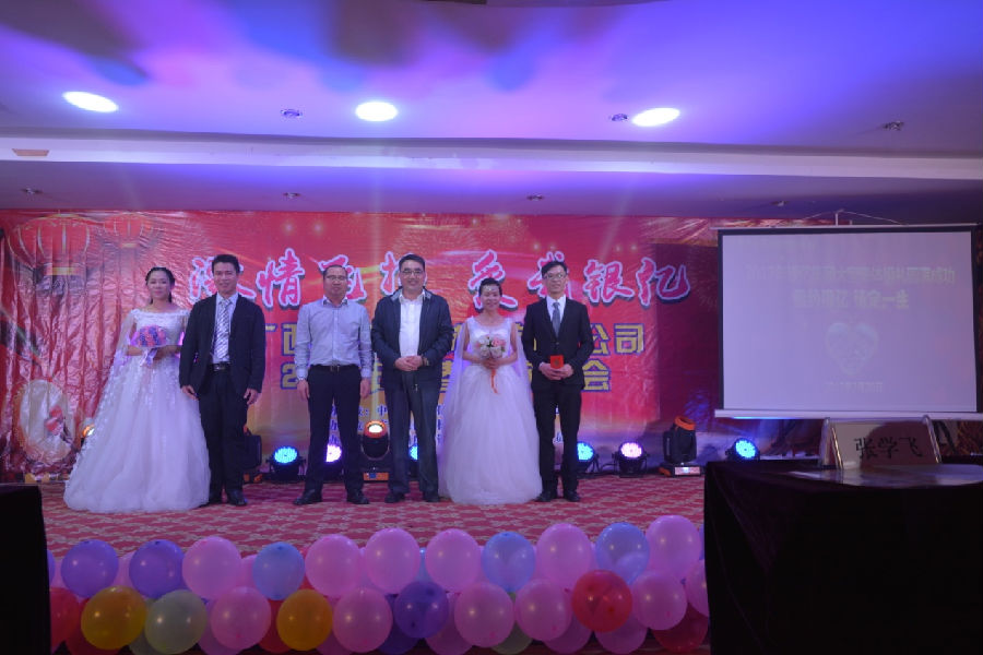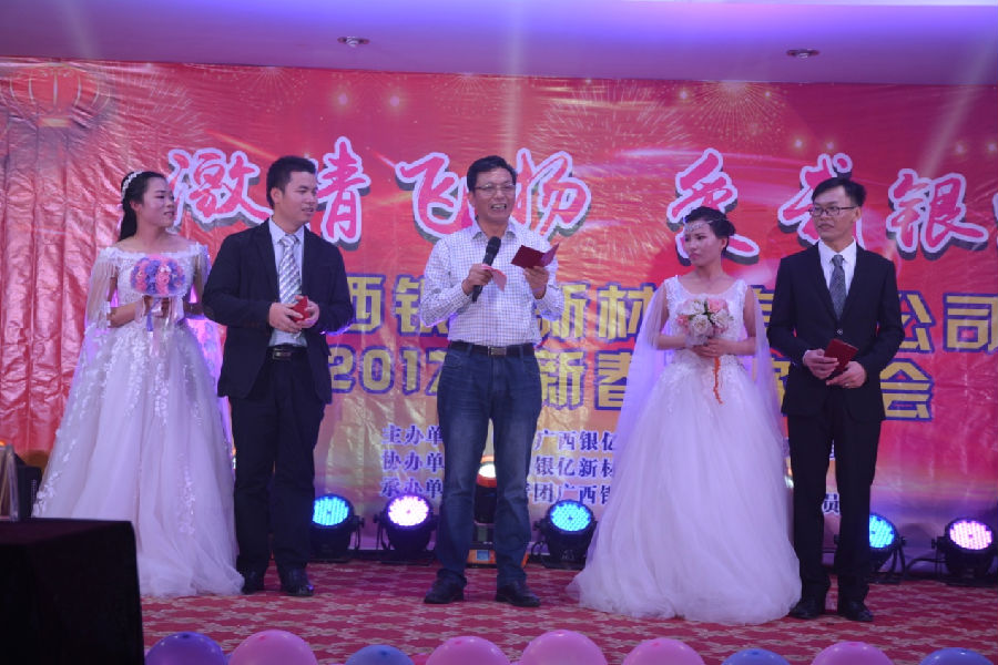 晚會中段安排了集體婚禮,給2對新人舉辦婚禮,將晚會歡樂的氣氛推向了高潮。新郎楊家樹和新娘吳秋麗;新郎藍偉東和新娘潘桂嬌,都是大學本科畢業(yè),學的是化學專業(yè),入職公司,工作勤勉,奮發(fā)向上,他們把心放在了工作上,把家安在了公司,把夢想放在了銀億事業(yè)上,產(chǎn)生了神奇的“化學反應(yīng)”,他們比翼齊飛,喜結(jié)連理,是眾望所歸,佳偶天成。廣西銀億公司工會主席章群宏作為證婚人,發(fā)表了熱情洋溢的證婚詞:“在今天大喜的日子里,我謹代表公司工會,向兩對新人表示熱烈地祝賀和美好地祝愿。衷心祝愿他們相濡以沫,白頭偕老,甜甜蜜蜜,幸福永遠,早生貴子!”章主席查看了兩對新人的《結(jié)婚證》,幽默地大聲說:“我宣布:新郎楊家樹和新娘吳秋麗;新郎藍偉東和新娘潘桂嬌,婚姻合法有效,即日起,持證上崗,掛牌營業(yè)!”全聲歡聲雷動,掌聲四起,經(jīng)久不息。這場集體婚禮,表達了員工“愛我銀億”的心聲――銀億凝聚人心,事業(yè)興旺發(fā)達!