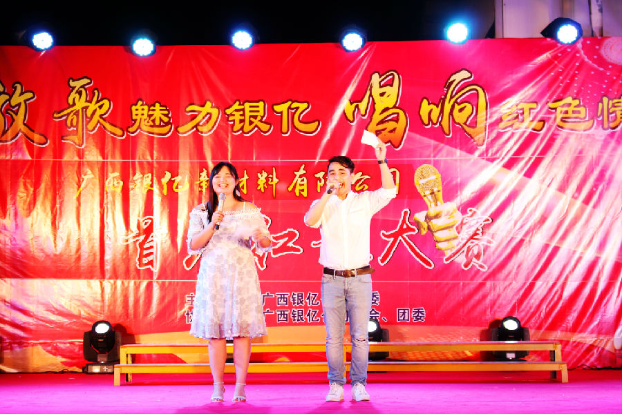 7時30分,風度翩翩的主持人朱旭波、周海華大步走向舞臺中央,宣布紅歌比賽正式開始,廣西銀億黨委副書記王小豐發(fā)表了熱情洋溢的祝詞。