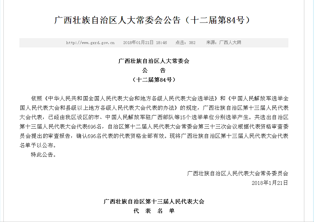 2018年1月21日,經(jīng)廣西壯族自治區(qū)第十二屆人民代表大會(huì)常委會(huì)第三十三次會(huì)議審查,確認(rèn)由自治區(qū)15個(gè)選舉單位依法選舉產(chǎn)生的696名廣西壯族自治區(qū)第十三屆人民代表大會(huì)代表資格全部有效。廣西銀億90后員工張新陽(yáng)當(dāng)選廣西壯族自治區(qū)第十三屆人民代表大會(huì)代表。
