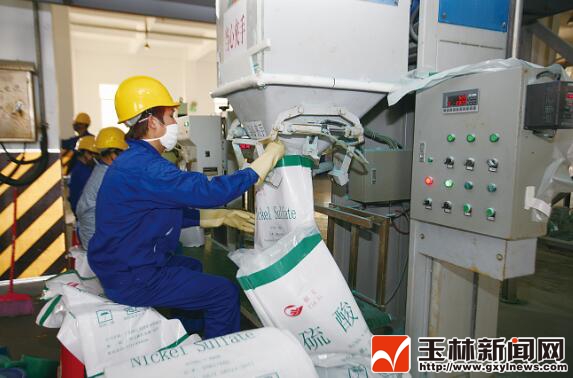 工人在對硫酸鎳產(chǎn)品進(jìn)行裝包。