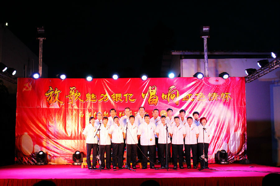 7時30分,風度翩翩的主持人朱旭波、周海華大步走向舞臺中央,宣布紅歌比賽正式開始,廣西銀億黨委副書記王小豐發(fā)表了熱情洋溢的祝詞。