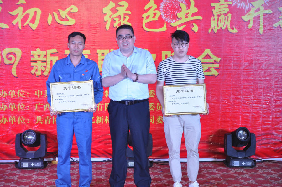 王小豐董事長(中)頒發(fā)廣西銀億獲集團先進基層工會組織及工會積極分子(劉美強左)